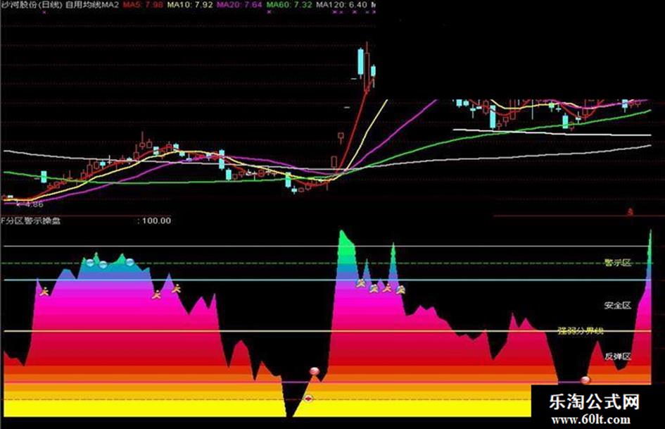 献给小散们端午节的小礼品——分区警示操盘副图指标,该指标参考了《寻庄问股》老师的(空军作战》指标的有关资料,重新编辑而美化而成的,图中分别指示了操盘的4个区域及买卖标识,相信小散们能看懂。过节了,大家玩玩,只图的快活