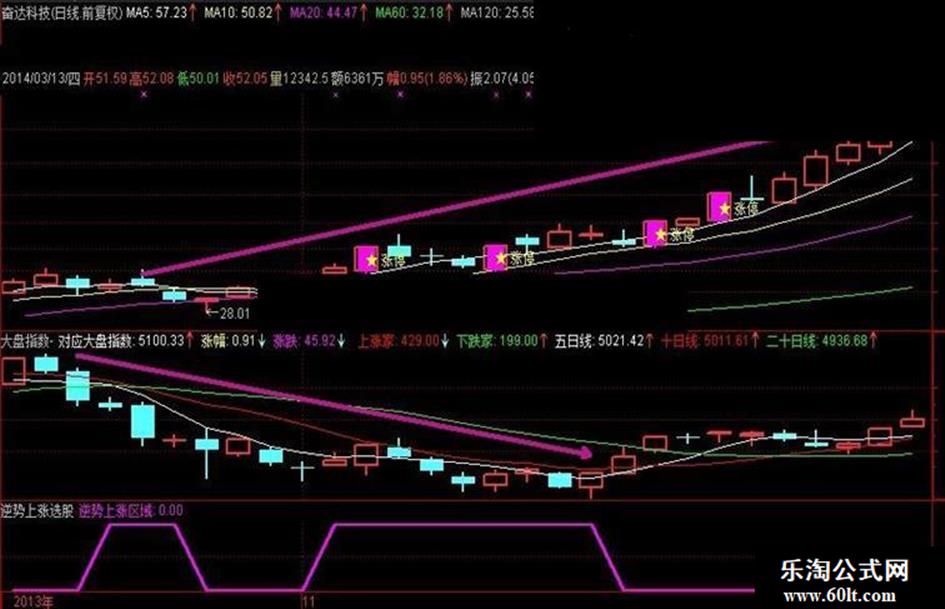 本指标选出的信号仅表明该股票处于逆势上涨趋势中,而并不是大多数人为的买入点,所以很多人抱怨信号太多,不准确。其实,指标的任务仅仅只是完成第一步工作,就是发出信号让你找出逆势上涨的股票,第二步是重点,就是研判股票的逆势上涨的趋势是否能够真正成立,延续下去。关键点在于,只要能买在这种逆势上涨趋势的延续性上,就成功了,不必在乎多赚或少赚几个点。理论上的最佳买点:应该是在个股回调末期和大盘企稳或反弹的结合点上。