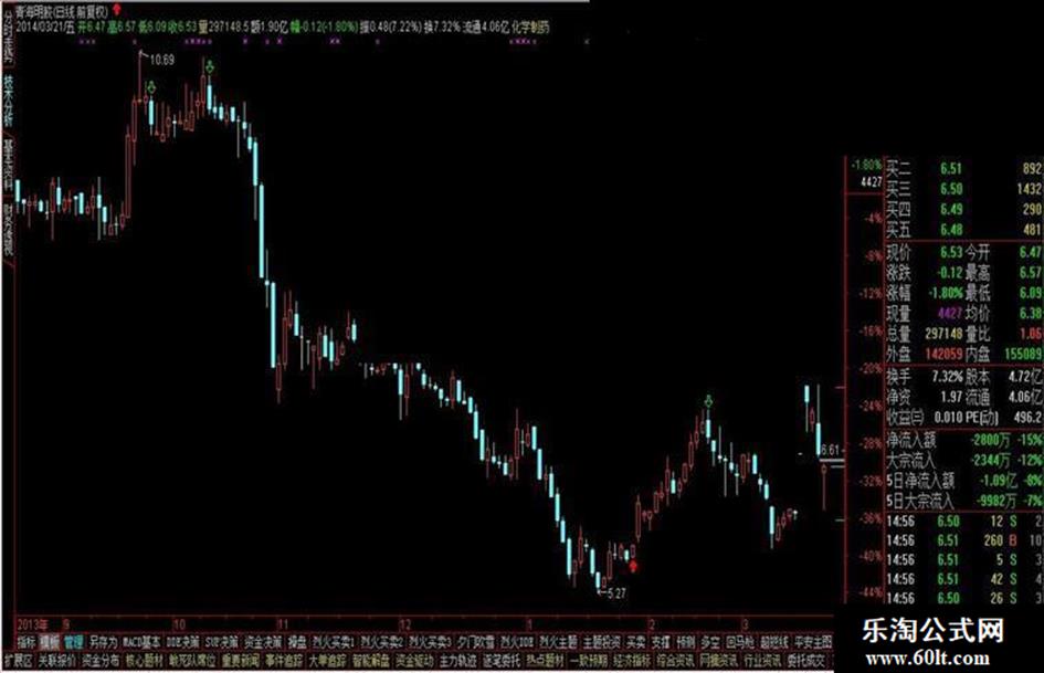 在分析图(K线图)里选择该专家系统公式,就可以在K线图里显示专家系统里的买卖点,一目了然。