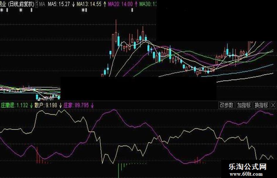 以前炒股,有个老师跟我说,跟着庄做才挣钱,后来我就找指标啊,各种找,后来找到一个,经过使用,还在用的一个显示庄散关系的指标,但是我其实就是看趋势 ,比较傻瓜的庄线上穿散线就买,相反卖,源码分享给大家,不是原创,在这谢谢原创老师,大家要是还有好用法就回帖提出来啦