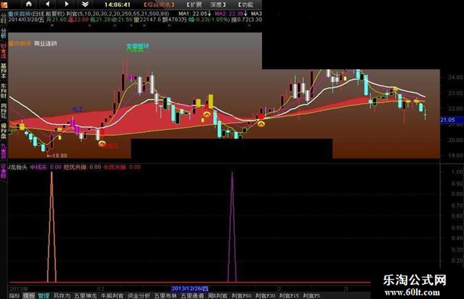 3.本公式取名J龙抬头,信号有3组:1)中线买:针对中线出现较大跌幅后转强反弹的个股;2)短优共振:指短周期J信号共振买点;3)长优共振:指长周期J信号共振买点。对于这样的3种信号,只是技术层面的可能买点,具体买卖请结合大盘、个股及个人的具体情况而定,风险自负!如果你用本公式赚钱了,是你用的操作有方,如果亏了,不要来骂我哦!