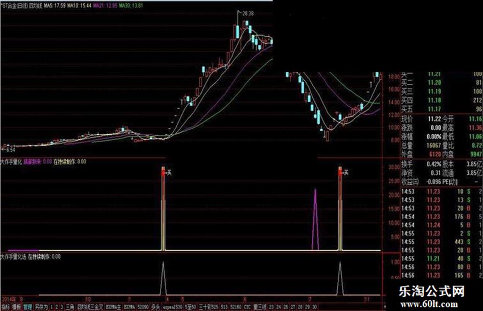 {大作手量化原创指标} 其实指标只是参考,并不是说发出信号就是买入的时候,这里要看当下发生(k体)所处的位置,形态,以及趋势(压力或支撑)切线(上切线,下切线)包括k体所处均线的位置或几日上穿某某线,在综合3,5,8,10日天的k体走势,包括周线,月线等,包括该股综合基本面初步了解,等一系列筛选过滤,这样才能有一种知根知底的感觉(这就是我们常说的盘感) 最终定夺,最终敲定!无限使用加密指标,放心使用,望大家理解!!