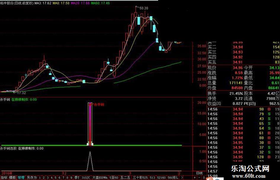 本人近期付出大量的时间和精力作写完成。采用加密无限永久使用,杀手锏指标是通杀所有疯股,妖股的利器和克星,杀手锏指标(同样理解用于大盘)。客观的讲,指标都不是绝对的,而是相对的,也时有失误的判断出现,还是那句话,技术指标只是参考,当你实盘操作前必须要建立在该股的基本面和技术面层面上的分析,它包括趋势,支撑,压力,长,中,短线相结合,最终敲定!!上图, 一张比一张猛!!!