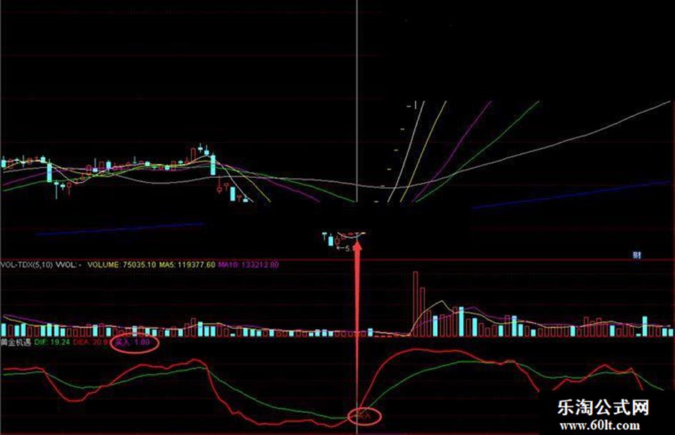 DRAWTEXT(CROSS(DEA,DIF) AND 买入,20,'买入'),COLORRED;