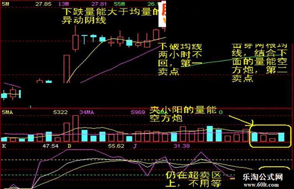 1,上涨阳量大于下跌阴量,我们称为良性量能,当某小时上涨阳量小于下跌阴量,同时随后出现的下跌阴量仍然在放大时,显示多空力量开始转化,空方占优,同时价格跌破5单位均线,指标在技术高位死叉,为卖点。我们取个简单而形象的名字“能量空方炮”。