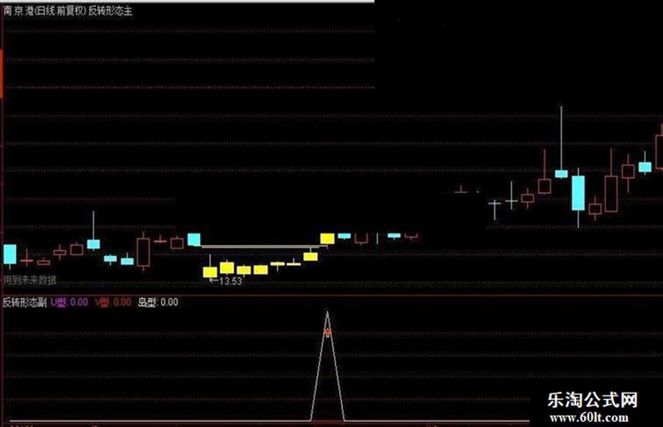 周末无聊,将论坛大神的三个不同的反转形态(分别是V型反转,U型反转和岛形反转)组合在一个指标里,更加方便看图,觉得有用的就拿去耍.向原作者致敬,有改动,侵删! 指标里有主图和副图两个.