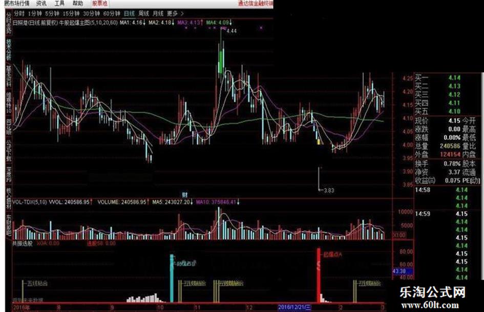 五线粘合:=IF(P1/C<10/100 AND MA1>REF(MA1,1) AND MA2>REF(MA2,1),888,0)COLORRED,LINETHICK2;