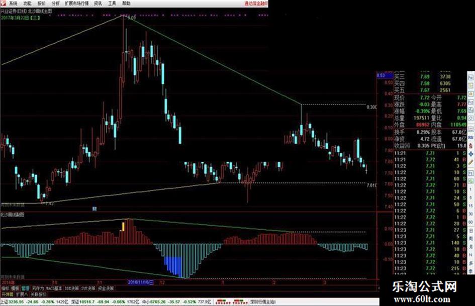 说明 1、背离信号:通过价格和指标画线颜色的反差、能直观地看到背离信号; 2、形态信号:上升旗形、下降旗形、收敛三角、扩张三角、V形等等、将直观地展现在眼前; 3、注意与成交量的配合、形态再好、没有量的支持、结局往往不乐观; 4、开放式源码:大家可根据自己需要增加画线数、直到满意为止; 5、瑕不掩瑜:本公式可能会漏掉细小信号、请大家体谅