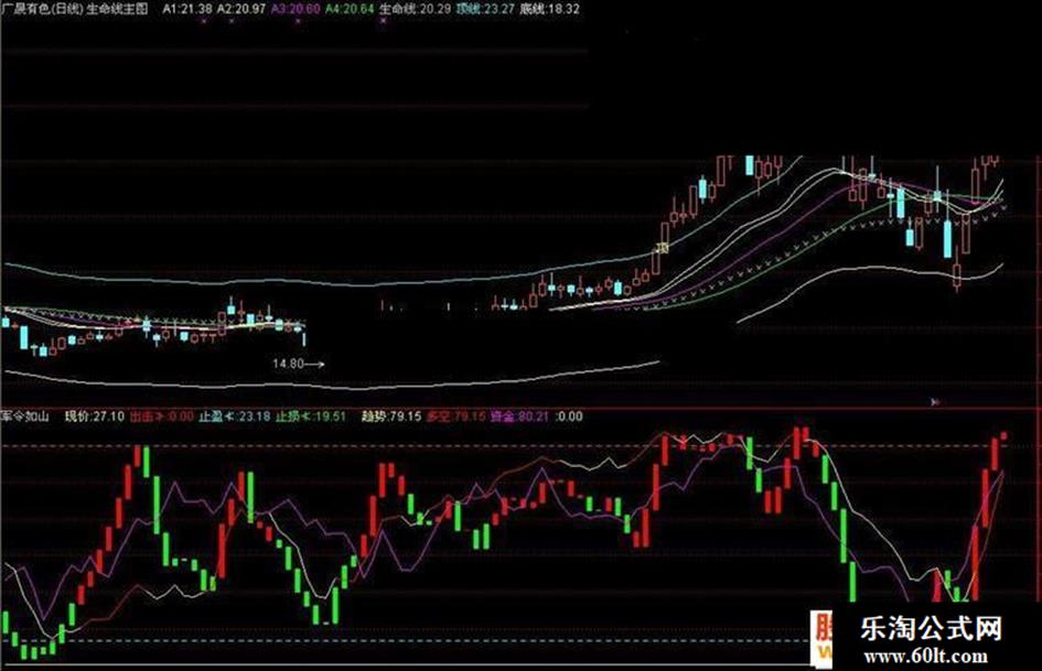 多空:IF(趋势>MA(趋势,5),趋势,DRAWNULL),COLORRED,LINETHICK1;