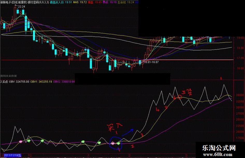 买点2:CROSS(OBV1,OBV2),COLORMAGENTA,NODRAW;