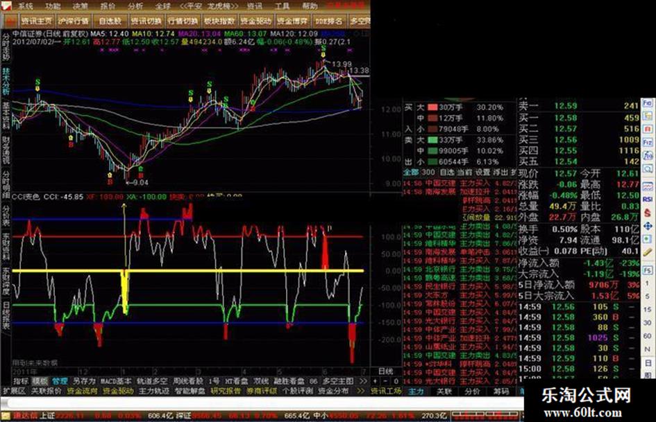 用法说明:CCI指标大家都熟悉,是做短线的利器,不用多说!指标共有五条线,最上下两条线为卖、买警戒线,中间线为强弱分界线,到风险和安全区域CCI会变色(有买卖指示,含有未来)只能做参考!