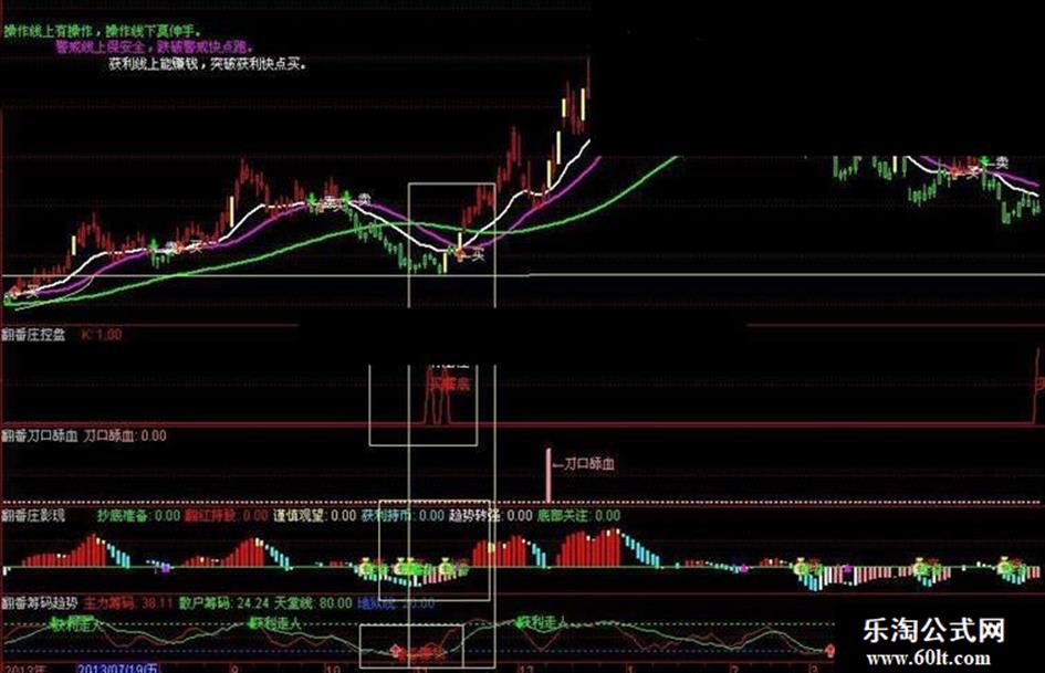 用法说明: 当筹码趋势指标出现准备赚钱信号,庄影现指标出现准备抄底信号,当庄控盘指标出现有庄信号,列入备选股池关注,当主图指标出现买入信号,股价站上获利线,激进操作者可以小仓位进入,当获利线,警戒线,操作线向上发散可全仓杀入,恭喜你骑上大牛了,刀口舔血指标用于上升趋势的强势股,可以追涨!