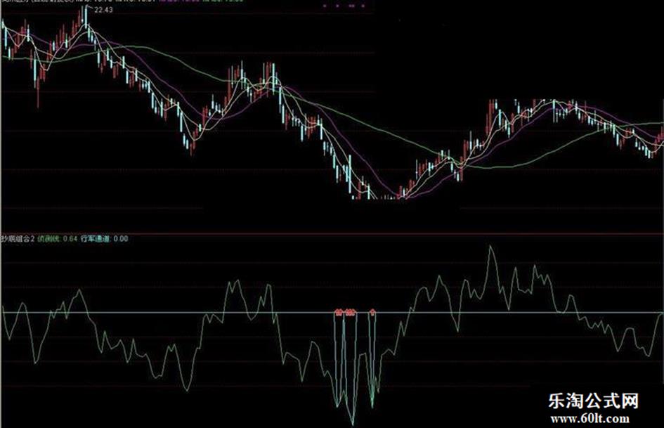 功能描述: 由一条侦测线和一条行军通道构成基本图形.行军通道出现快速下凹,预示发现股价低位,当行军通道再次回升到0线时可做买进操作.侦测线用于判断当前股价运行趋势.位于行军通道以下为弱势,反之为强势.也可以利用侦测线与行军通道的金叉和死叉进行买卖操作(如图)