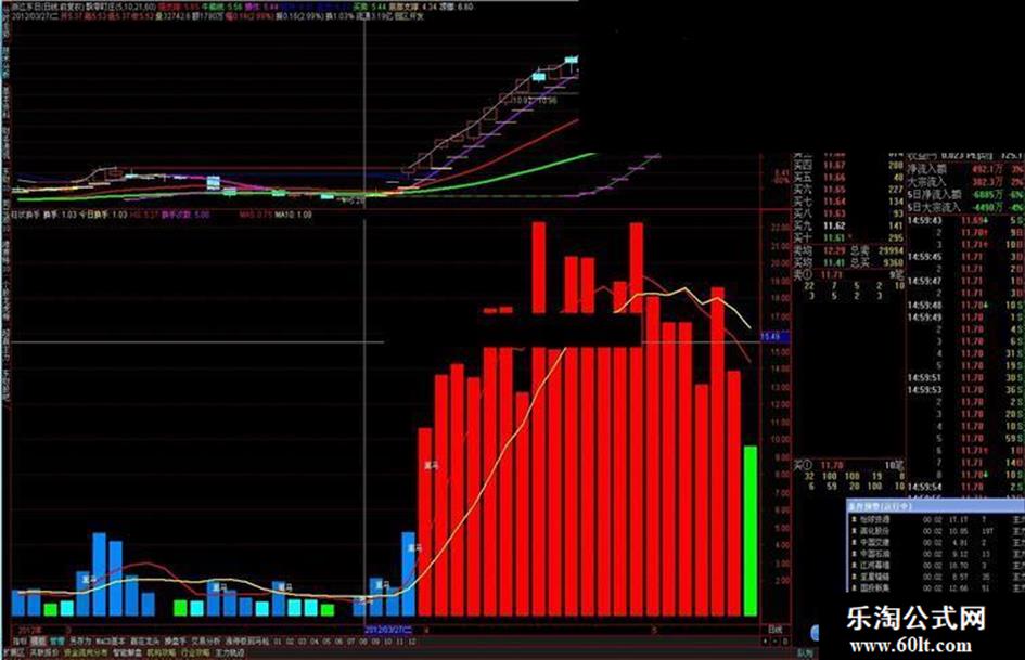 指标说明:此指标将换手率的数值以柱状表示,并配有5日换手均线与10日换手均线,就跟成交量的vol指标差不多,当换手率由小变大到10%,并且这时成交量是前一天的2倍以上,则出现一个"黑马"的信号。
