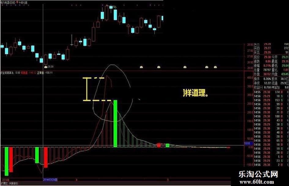 STICKLINE(CROSS(正常值,背离值),0,正常值*1.2,3,0),COLORGREEN;