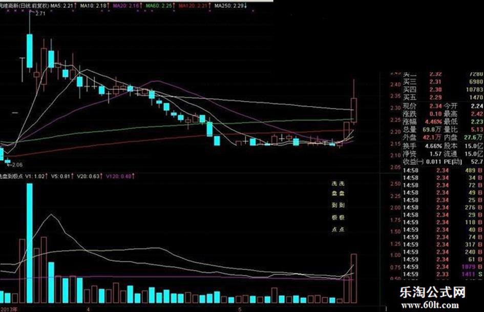 说明:当出现洗盘到极点信号时,可以分批建仓,当V5快要上穿v20时,就是要拉升了;