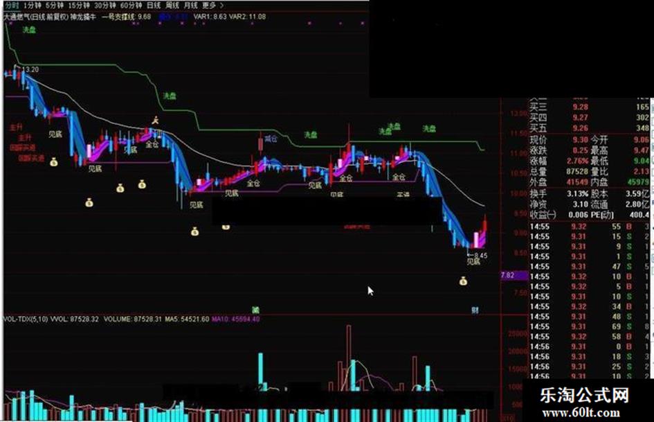 AND CLOSE<MA(CLOSE,13)*1.3,1,0),LOW*0.88,'抄底'),COLORBROWN;
