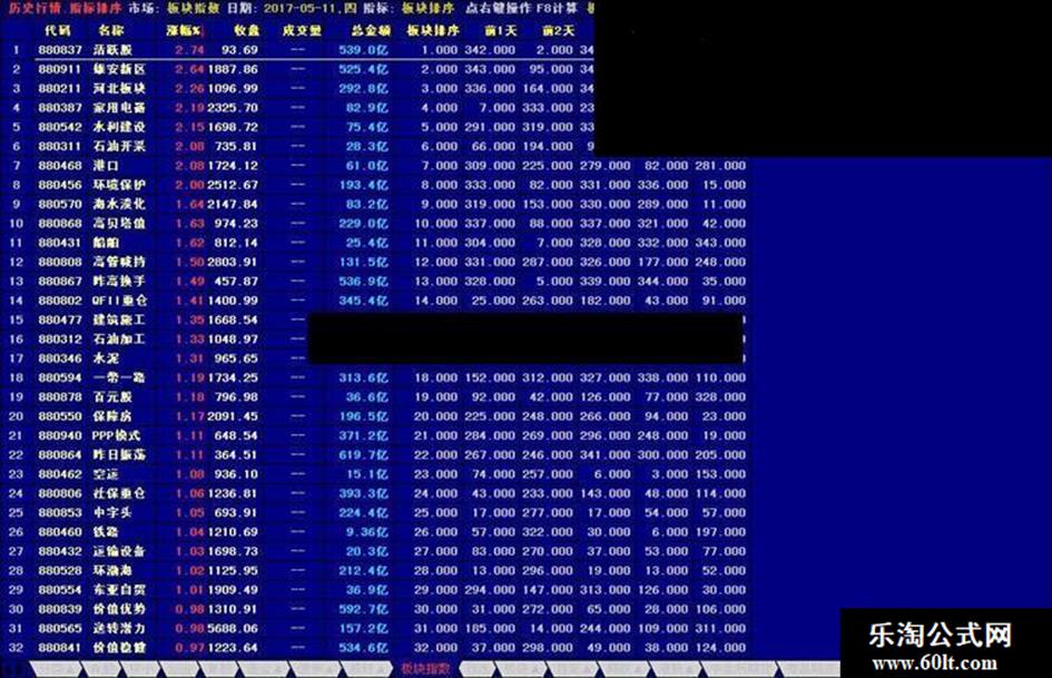 指标下面加上以下源码,就可得以前5天的板块排序, 前1天:REF(板块排序,1),COLOR00FFFF; 前2天:REF(板块排序,2),COLOR00FFFF; 前3天:REF(板块排序,3),COLOR00FFFF; 前4天:REF(板块排序,4),COLOR00FFFF; 前5天:REF(板块排序,5),COLOR00FFFF; 板块排序{总股本} 板块排序:HORCALC('板块指数',105,1,0),COLOR00FFFF;
