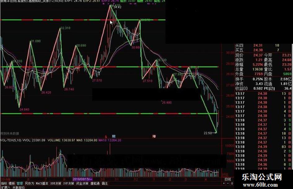 NOTEXT下笔划线:DRAWLINE(顶,H,底,L,0),COLORLIGREEN,LINETHICK3;