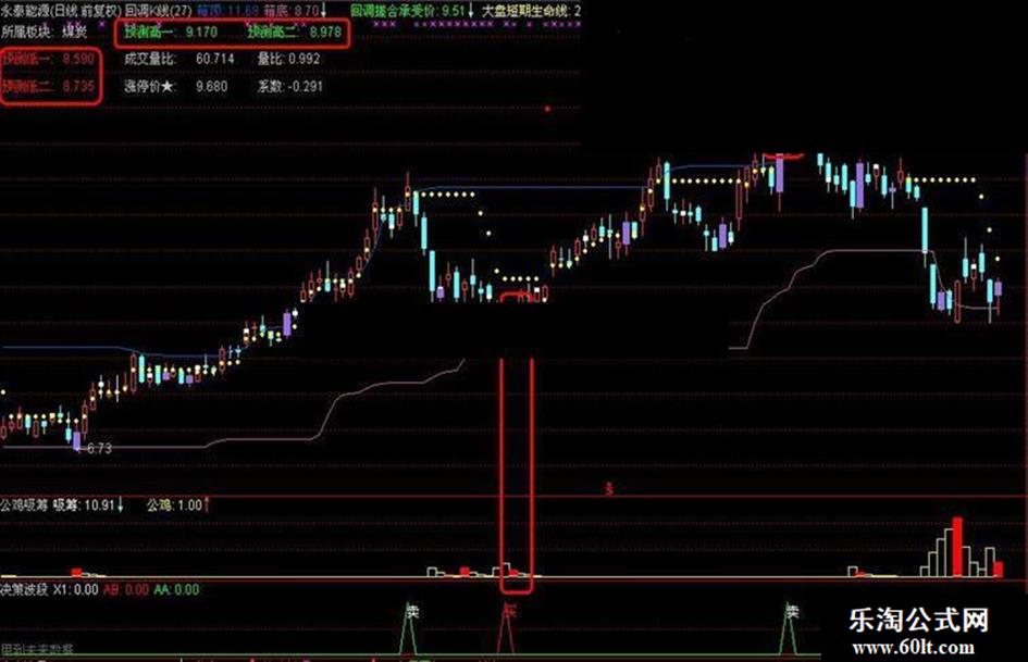 紫色K线加公鸡吸筹选股,箱顶配有未来的决策波段来逃顶,箱顶配回调止赢做短线。