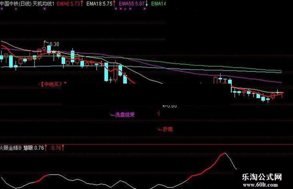 火眼金睛:=6.5*MA(((C+L+(H+C)/2)/3-LLV(L,13)) /(HHV(H,13)-LLV(L,13)),3),COLORRED; 第三只眼:=6.5*(((C+L+(H+C)/2)/3-LLV(L,21)) /(HHV(H,21)-LLV(L,21))),COLORFFFFFA; 慧眼:MA((火眼金睛+第三只眼)/2,2)*0.4; IF(慧眼>REF(慧眼,1)AND 慧眼>=0.5 ,慧眼,DRAWNULL),COLORRED,LINETHICK2;