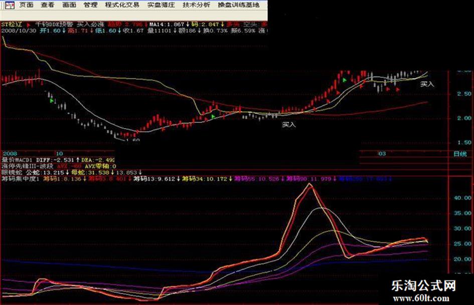 3、使用时,每一条短周期的筹码线上穿长周期的筹码线,均是筹码收集的过程,上穿角度越大,筹码收集越快,表明有强庄位于其中。