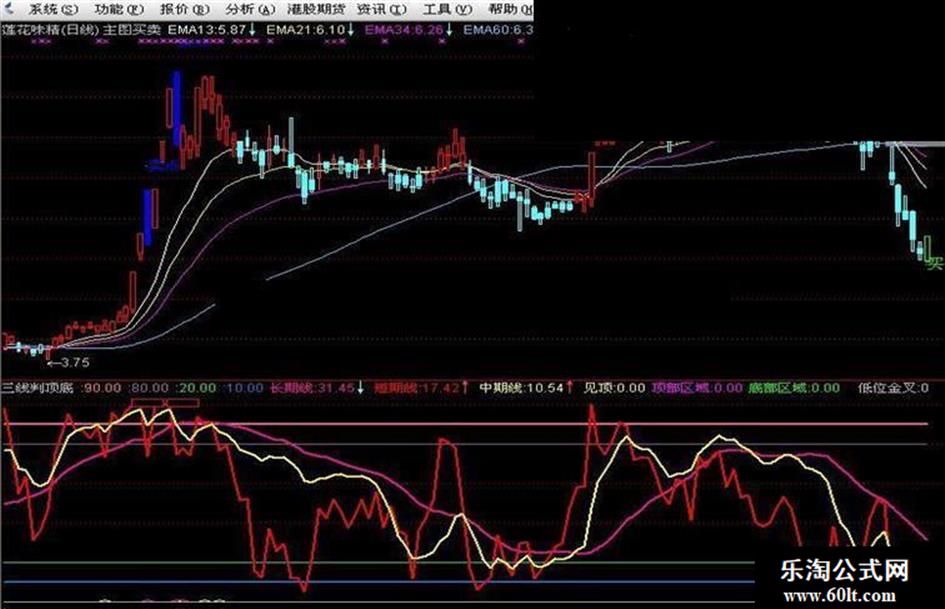 顶部区域:(中期线<REF(中期线,1) AND REF(中期线,1)>80) AND (REF(短期线,1)>95 OR REF(短期线,2)>95 ) AND 长期线>60 AND 短期线<83.5 AND 短期线<中期线 AND 短期线<长期线+4;
