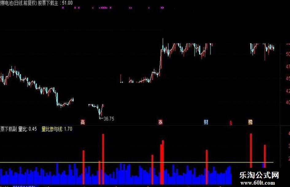 量比:VOL/REF(MA(VOL,5),1),COLORRED,LINETHICK0; STICKLINE(量比>0,0,量比,2,0),COLORBLUE; STICKLINE(量比>=1.7,0,量比,2,0),COLORRED; 量比参与线:1.7,COLORYELLOW;