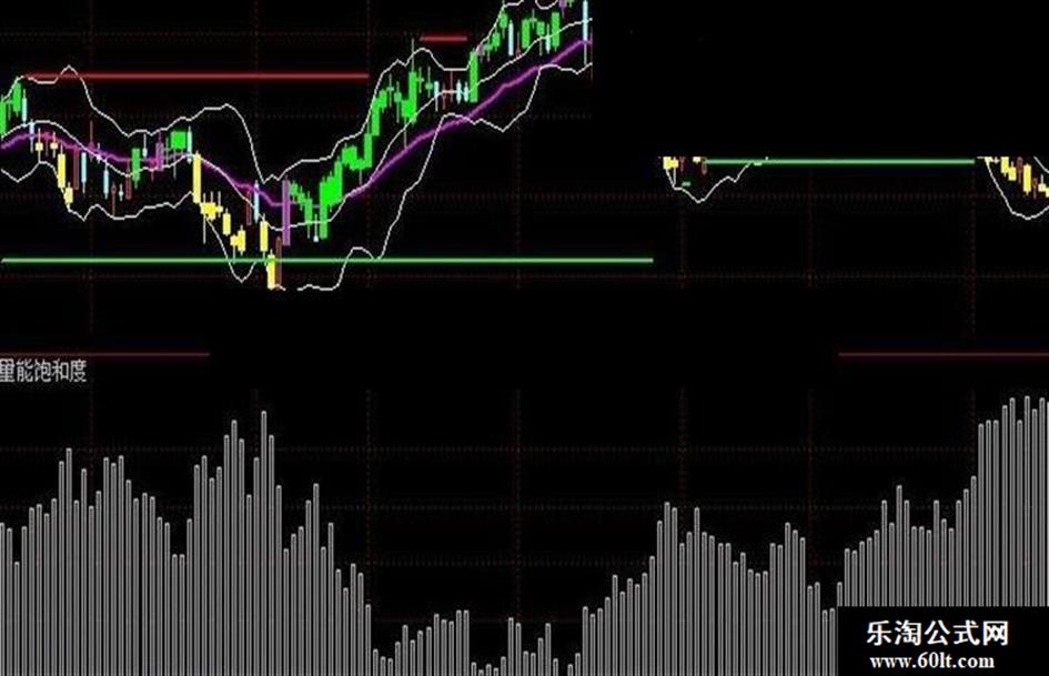 AA:=100*(HHV(HIGH,68)-CLOSE)/(HHV(HIGH,68)-LLV(LOW,68)); 量能:STICKLINE(AA>=2,AA,0,2,1),COLORBBBBBB; 饱和:STICKLINE(AA>=99,AA,0,2,1),COLORRED; 饱和度:STICKLINE(AA>=99,90,100,2,1),COLORGREEN;