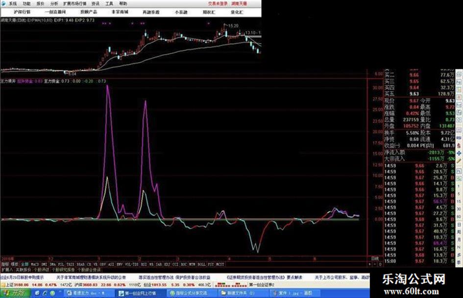 说明:红线是主力资金 主力在不断地吃货 主力资金上升的角度大于35的时候就变成黄色线 大于45度时就能出现连续的涨停 紫线是拉升资金也就是游资散户 青色是主力出货 。