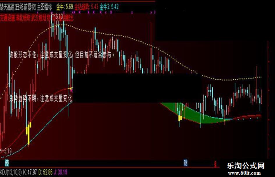 DRAWTEXT_FIX(情况13=1,0.035,TS13,0,'该 股 形 态 不 佳 ,注 意 成 交 量 变 化,但 目 前 不 适 合 参 与 。'),COLORWHITE;{白}
