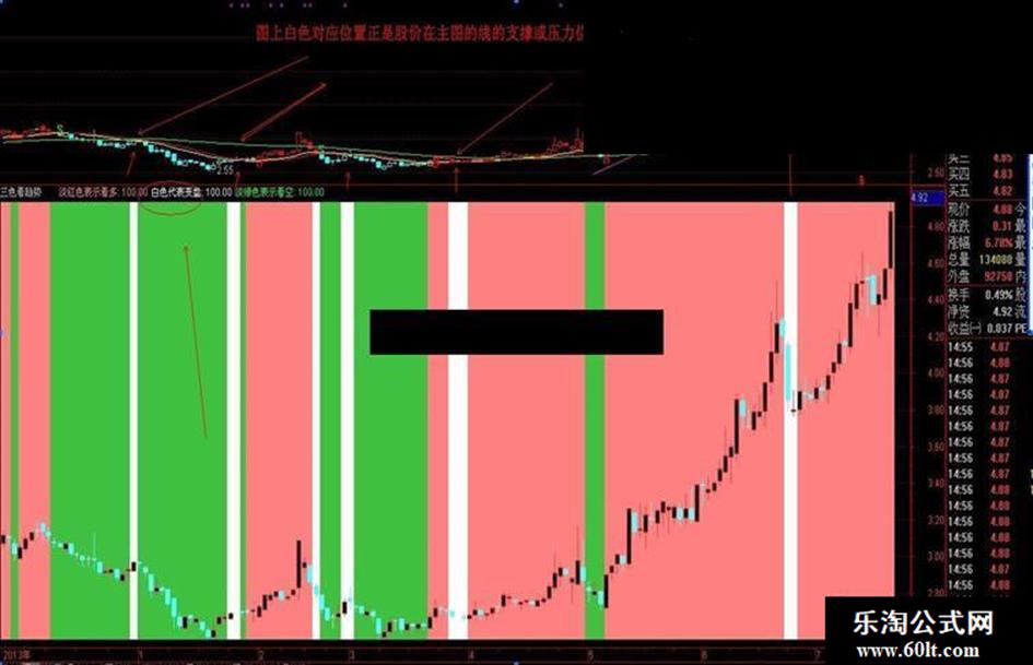 粉红色是上升持股趋势,相当于我主图的B点段,绿色代表下降趋势,相当于主图的S点段。而它多了个白色,我看了下,白色出现的位置在我的主图上,不是顶在压力线,就是回到支撑线的位置,如果继续向上或向下,就会打破主图 的B S点了,应该是非常高明的。提示我们要看好走势。