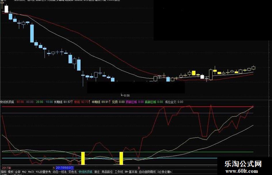 顶部区域:(中期线<REF(中期线,1) AND REF(中期线,1)>80) AND (REF(快线,1)>95 OR REF(快线,2)>95 ) AND 长期线>60 AND 快线<83.5
