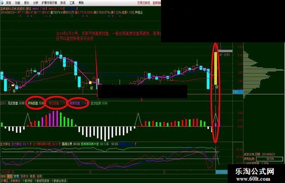 高度控盘:IF(VAR2>50 AND COST(85)<CLOSE AND 控盘>0,控盘,0),COLORFF00FF,NODRAW;