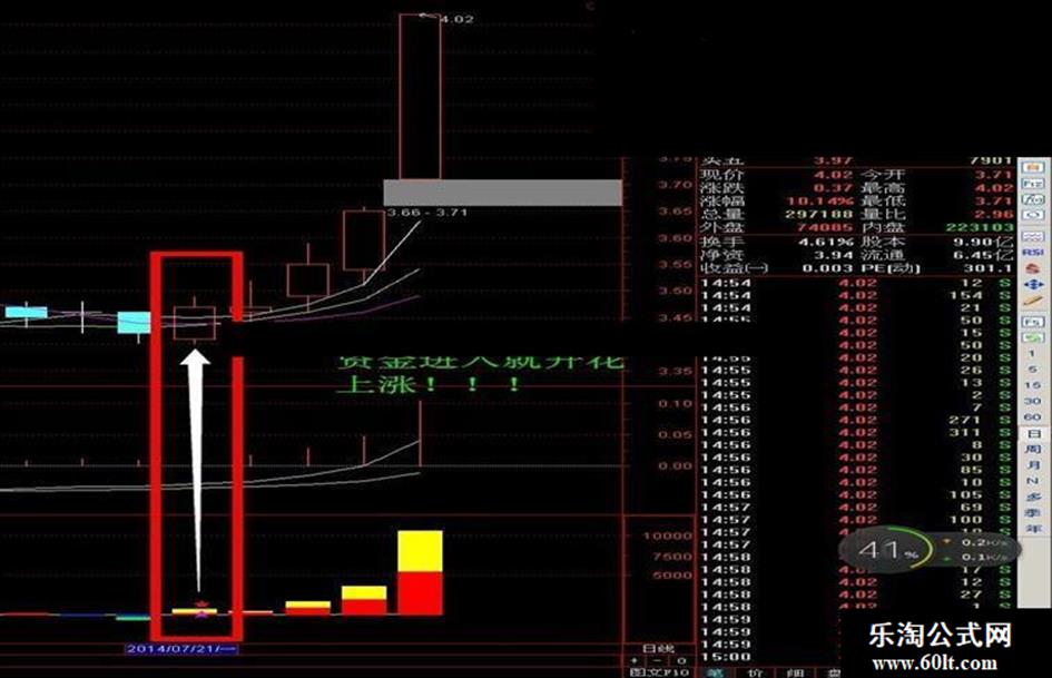 进出比例%:IF((HSL*0.4+LLJX)>0,资金流入/万元*100,资金流出/万元*100),COLORYELLOW;