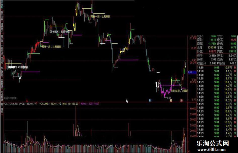 价格低点:IF(JTS>0,DRAWLINE(JC,L,REF(JC,1),REF(L,1),1),DRAWNULL),COLORMAGENTA,LINETHICK2;
