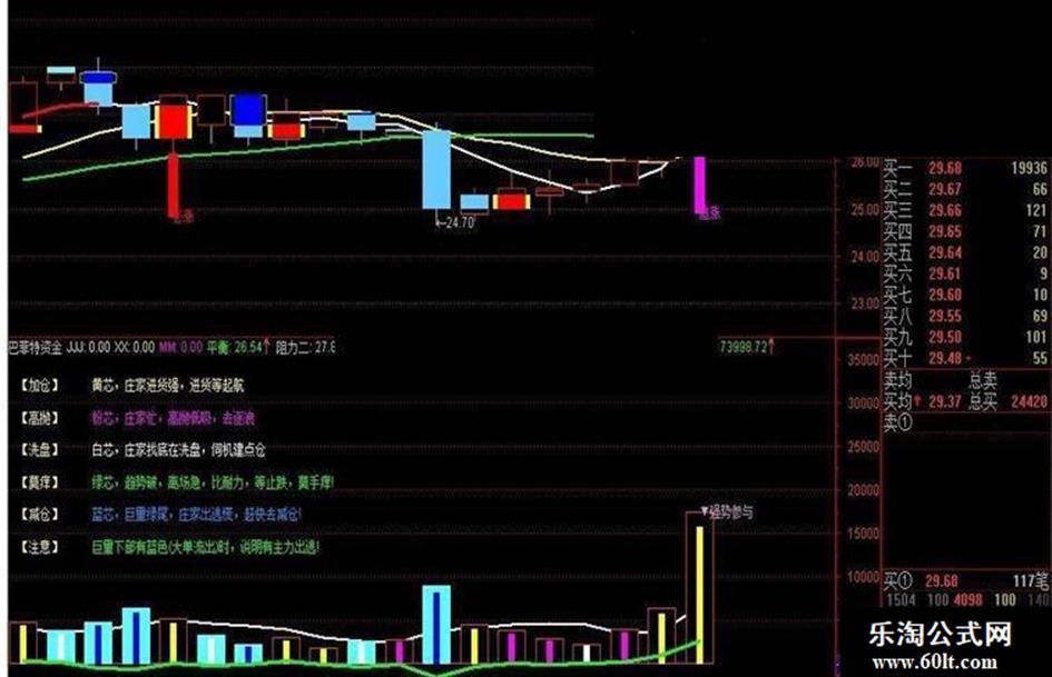 DRAWTEXT_FIX(1,0.1,0.55,0,'巨量下部有蓝色(大单流出)时,说明有主力出逃!'),COLOR00FF00,LINETHICK2;