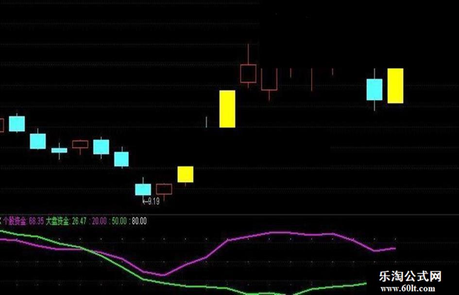 个股资金:EMA(100*(C-LLV(LOW,34))/(HHV(H,34)-LLV(LOW,34)),3), COLORMAGENTA,LINETHICK2; 大盘资金:EMA(100*(INDEXC-LLV(INDEXL,34))/(HHV(INDEXH,34)-LLV(INDEXL,34)),3),COLORGREEN,LINETHICK2; 20,POINTDOT,COLORF00FF0; 50,POINTDOT,COLORGREEN; 80,POINTDOT,COLORWHITE;