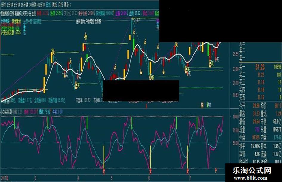 先看一下指标,其实很简单的两条线,记着金叉做好买的准备,死叉立即执行卖出,决不犹豫,就算下一步涨停也不后悔.黄柱代表出手,紫色柱代表加仓介入,绿柱是必须找高点出局.当红箭头与买的标记'B'重合,就别迟疑了.
