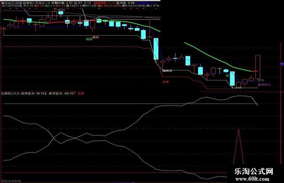 涨:IF(短趋势线>REF(短趋势线,1),短趋势线,DRAWNULL),COLORRED,LINETHICK3;