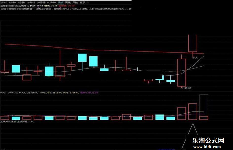 三线开花:(CROSS(快线,慢线) AND REF(CLOSE,1)>快线 AND VOL/REF(VOL,1)>1);