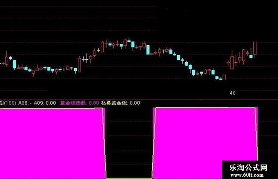 黄金线选股:IF(((CROSS(A09,0.009) AND (OPEN && LOW)) AND (CLOSE && LOW)),20,0),COLORFF00FF;