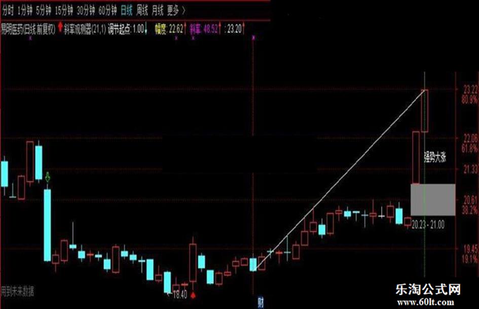 DRAWTEXT(斜率>=60 AND CROSS(A2 ,0.5 ),H*1.01 ,'强势暴涨' );