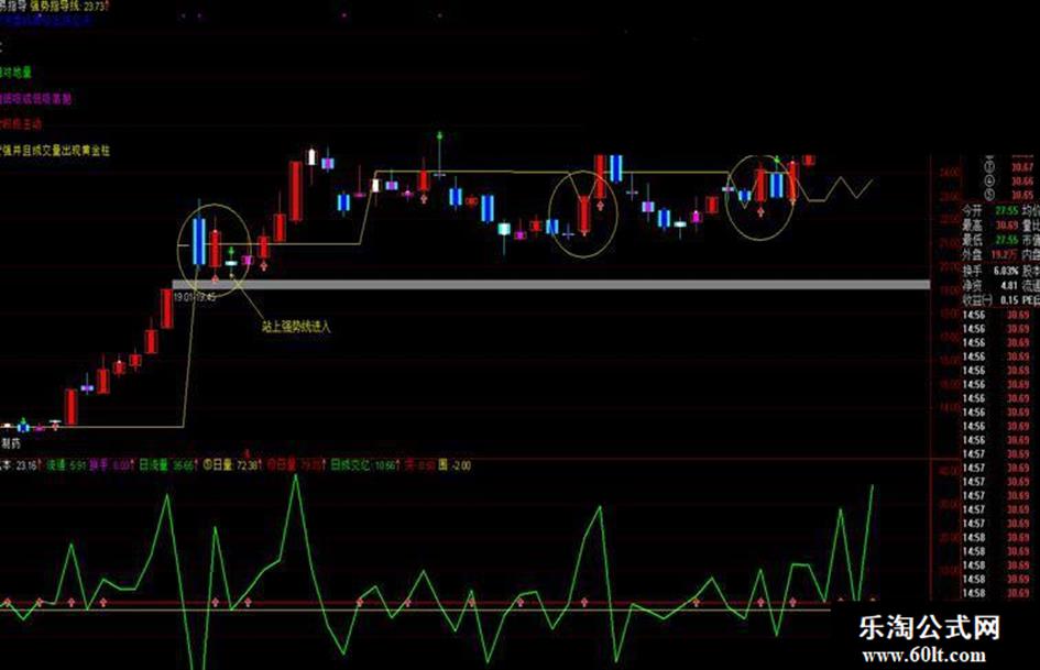 操作说明;再发一次试试,偶好像8点多发的这个帖子一直没有见出来,呵呵 ,【建议指标区还是应该回帖给鼓励才好】偶做这个主图是受坛子里两位老师的启发而作,K线每日提示参考,偶加入一根强势线,