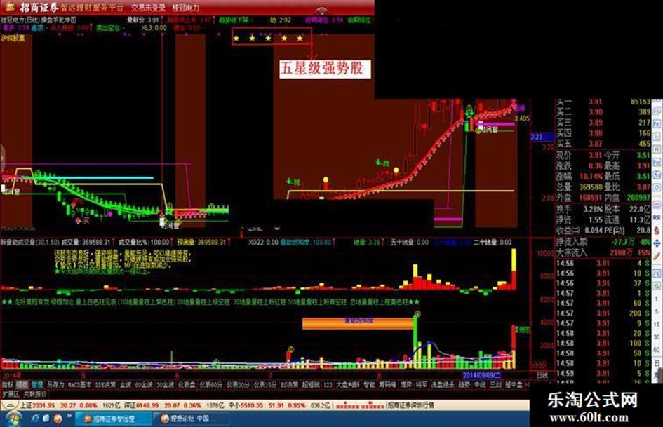 趋势线上升:IF(HS,趋势线,DRAWNULL),LINETHICK2,COLORRED;