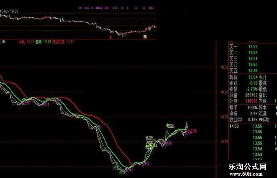趋势:LLV(MA(H,13),1),COLORGREEN,LINETHICK2;