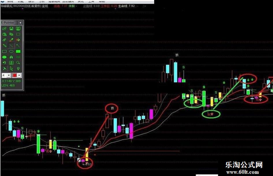 IF(CROSS(生命线,工作线),HIGH*1.04,DRAWNULL),CIRCLEDOT,COLORGREEN;