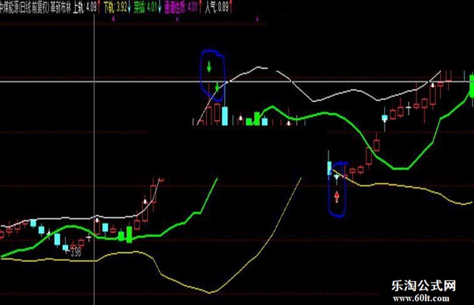 本人一直喜欢布林带,但是总觉得以中线来区分走势的强弱既勉强又滞后,经过革新,设置了一条穿插线,取代了中线的大部功能,同时又能提示买卖,当其下穿K线时后市多为涨;当其上穿K线时后市多为跌。无论上穿下穿,K线变绿以便醒目。激进者还可根据上下轨附近的箭头提示买卖,绝对不是未来函数,放心使用。