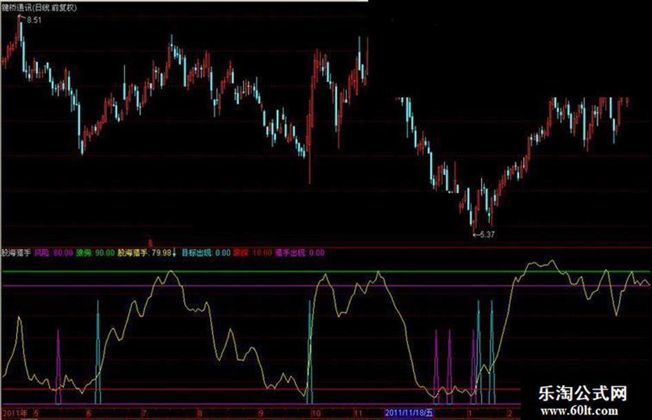 目标出现:IF(CROSS(股海,90) AND (股海猎手<40),70,0),COLORFFFF00;