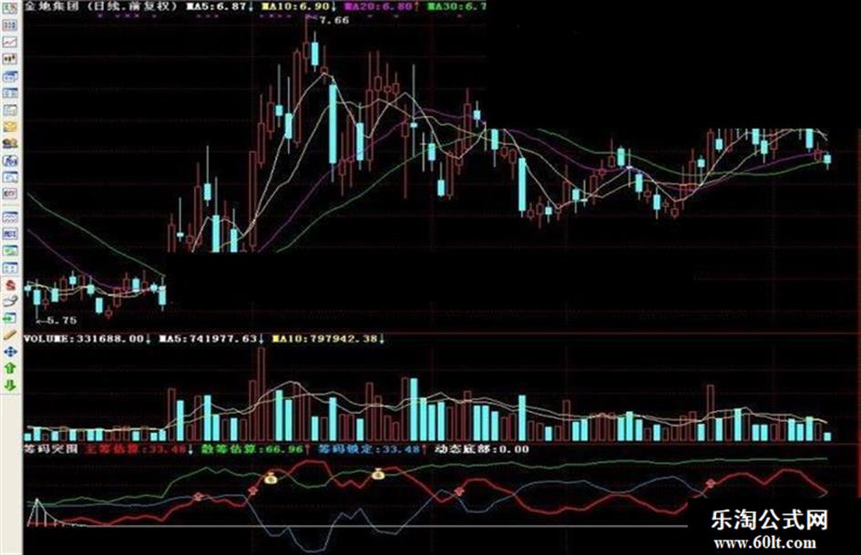 动态底部:EMA(IF(L<= LLV(L,99),SMA(ABS(L-REF(L,1)),99,1)/SMA(MAX(L-REF(L,1),0),99,1),0)*5,3)*5,COLORWHITE,LINESTICK;